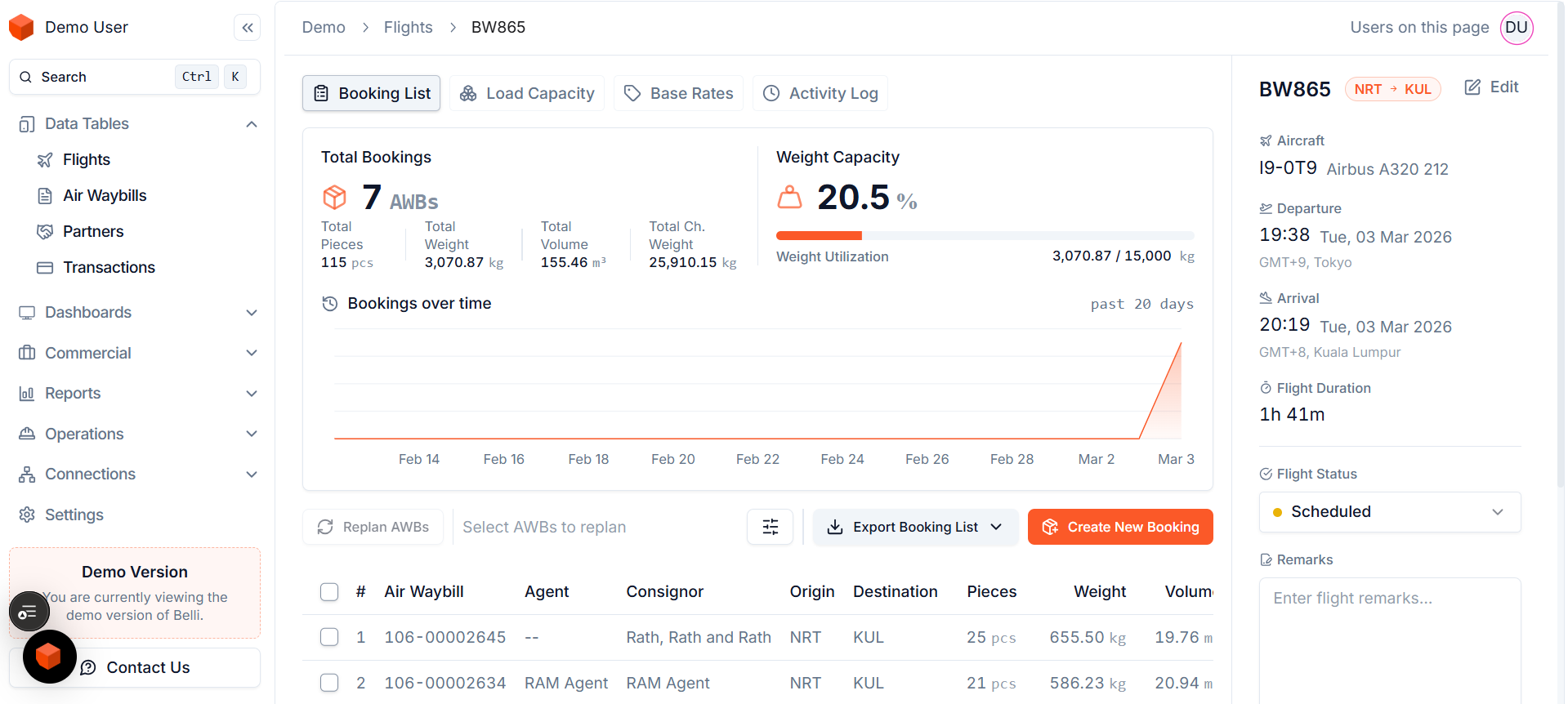 Belli's capacity management module gives your revenue and operations teams full visibility over available space across every flight in your network. Load factors, weight limits, volume constraints, and allotments are all managed in one place, with real-time updates as bookings come in. Whether you're optimising belly-hold on a narrow-body or managing a dedicated freighter, Belli ensures you're never leaving revenue on the table and never accepting more than the aircraft can safely carry.
