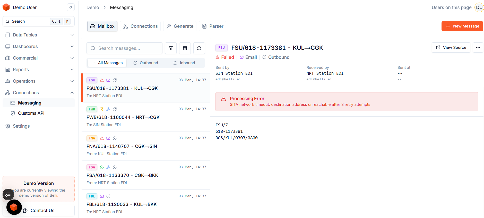 Belli handles the full spectrum of IATA cargo EDI messaging out of the box. FWB, FHL, FSU, FFM, and beyond are all generated, validated, and transmitted automatically as shipments move through your operation. Data flows reliably to handling agents, ground handlers, customs authorities, and partner carriers without manual re-keying or integration headaches. Your messages go out clean, on time, and in the right format every time.