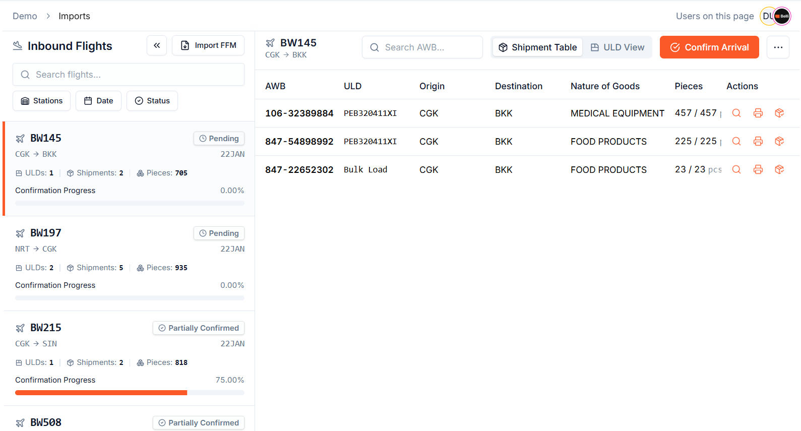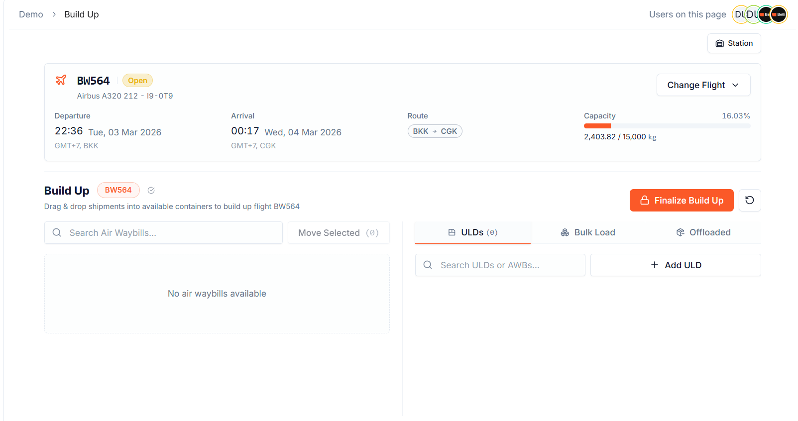 Belli gives your warehouse team clear build-up instructions tied to flight cut-off times, destination requirements, and weight distribution guidelines. Progress is tracked in real time so supervisors always know the status of each ULD without having to walk the floor. Freight gets loaded correctly, on time, and in full compliance with the requirements of each flight.