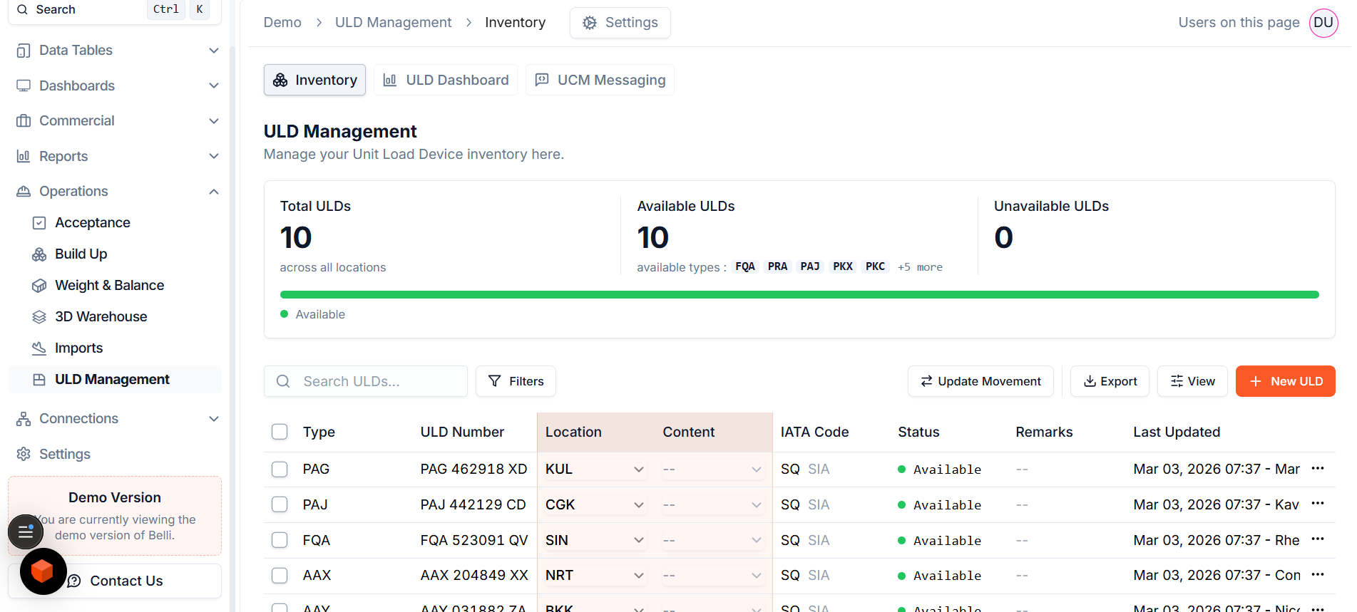 Belli tracks every Unit Load Device across your network in real time, from assignment and build-up through to offload and return. Your team always knows where each ULD is, what's in it, and where it needs to go next. Overage charges from lost or overdue ULDs are reduced, and the manual reconciliation work that typically falls on operations staff is handled automatically by the system.
